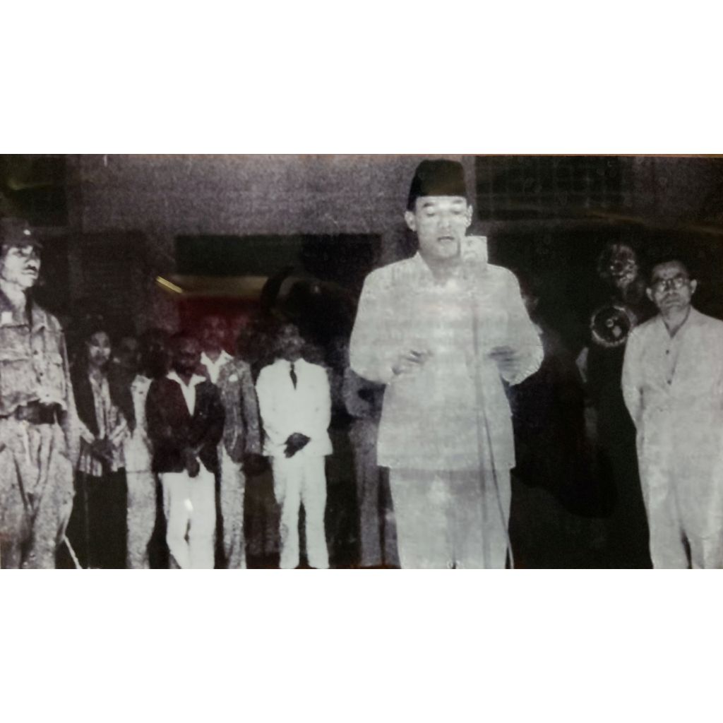 Repro foto suasana pembacaan proklamasi kemerdekaan Indonesia di jalan Pegangsaan Timur No. 56, Jakarta pada 17 Agustus 1945.